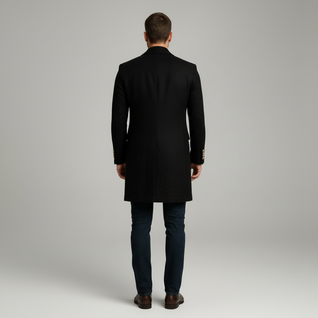Men’s Long Coat – Black, Single-Breasted, Gold-Button Detail 1